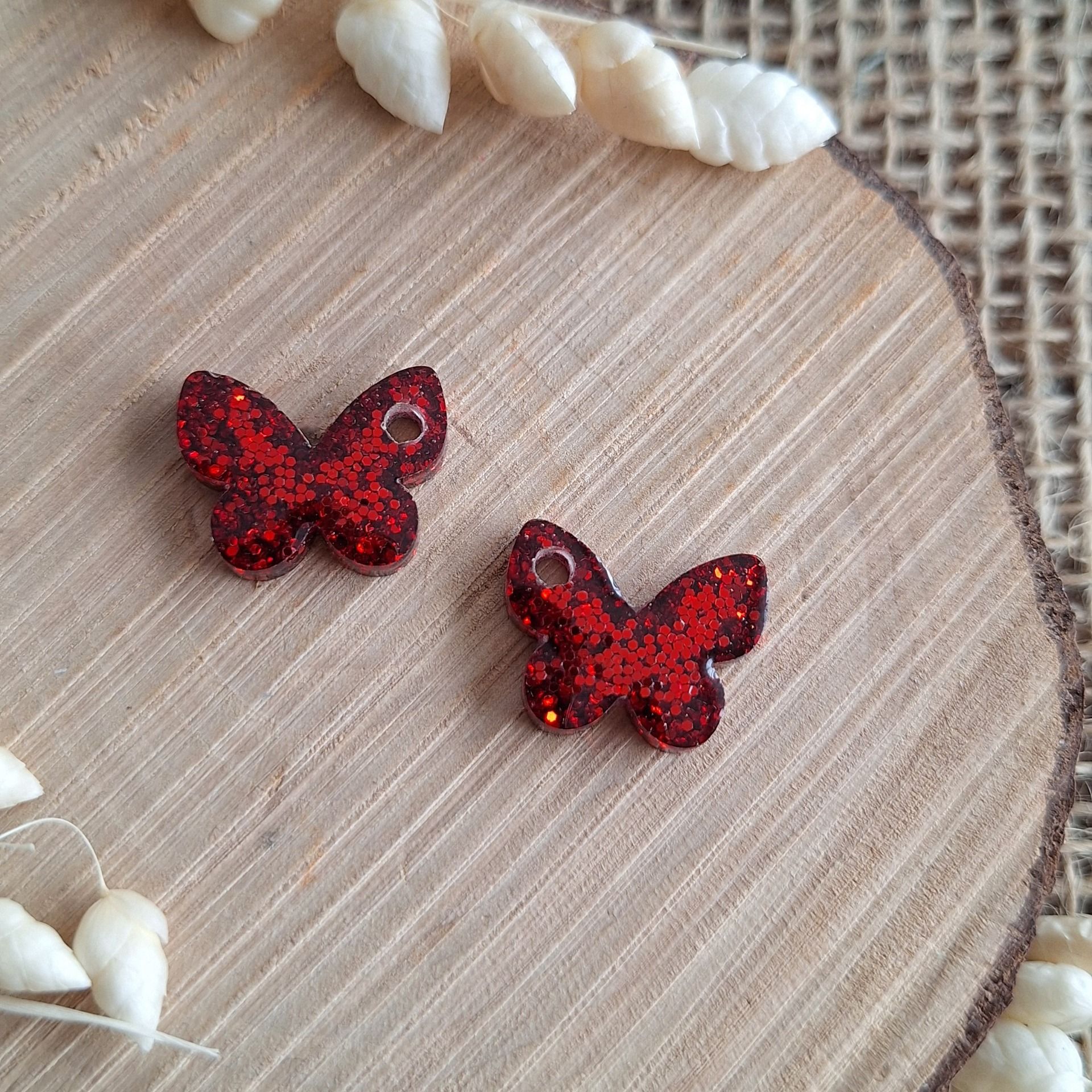 Réalisation en résine époxy de forme Papillons de couleur rouge paillettes