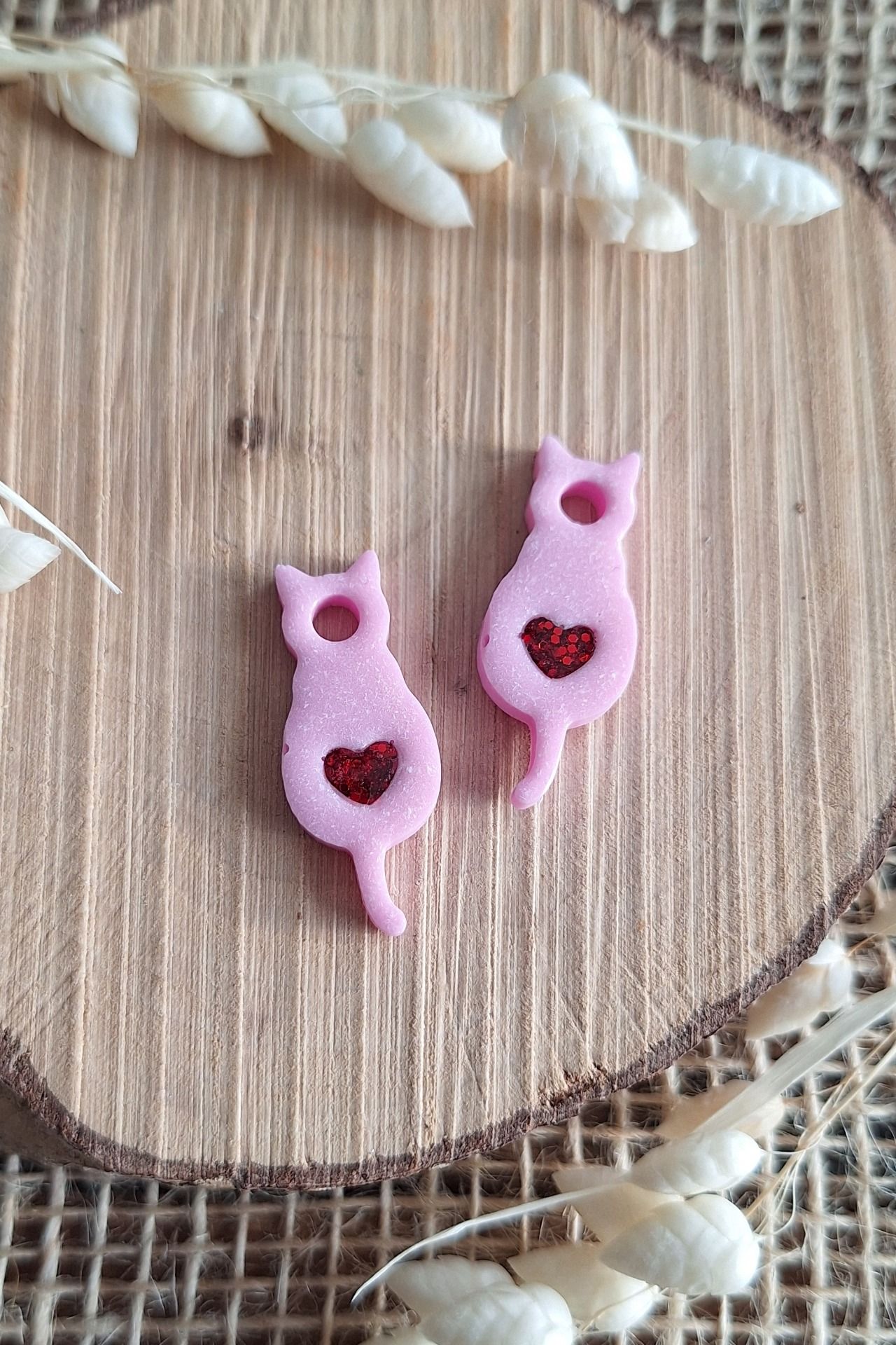 Réalisation en résine époxy en forme de chat rose avec cœur rouge paillettes
