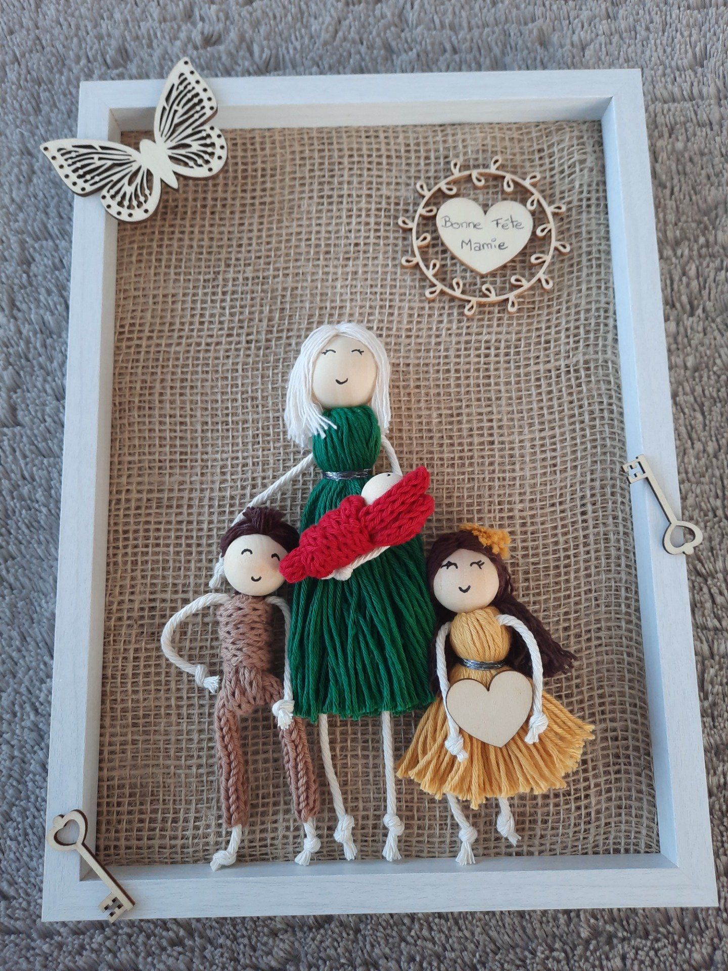 Un cadre plein de tendresse pour représenter les liens précieux entre une mamie et ses petits-enfants. Chaque poupée est réalisée à la main avec soin afin de symboliser chaque membre de la famille. Une création unique et à personnalisée sur demande