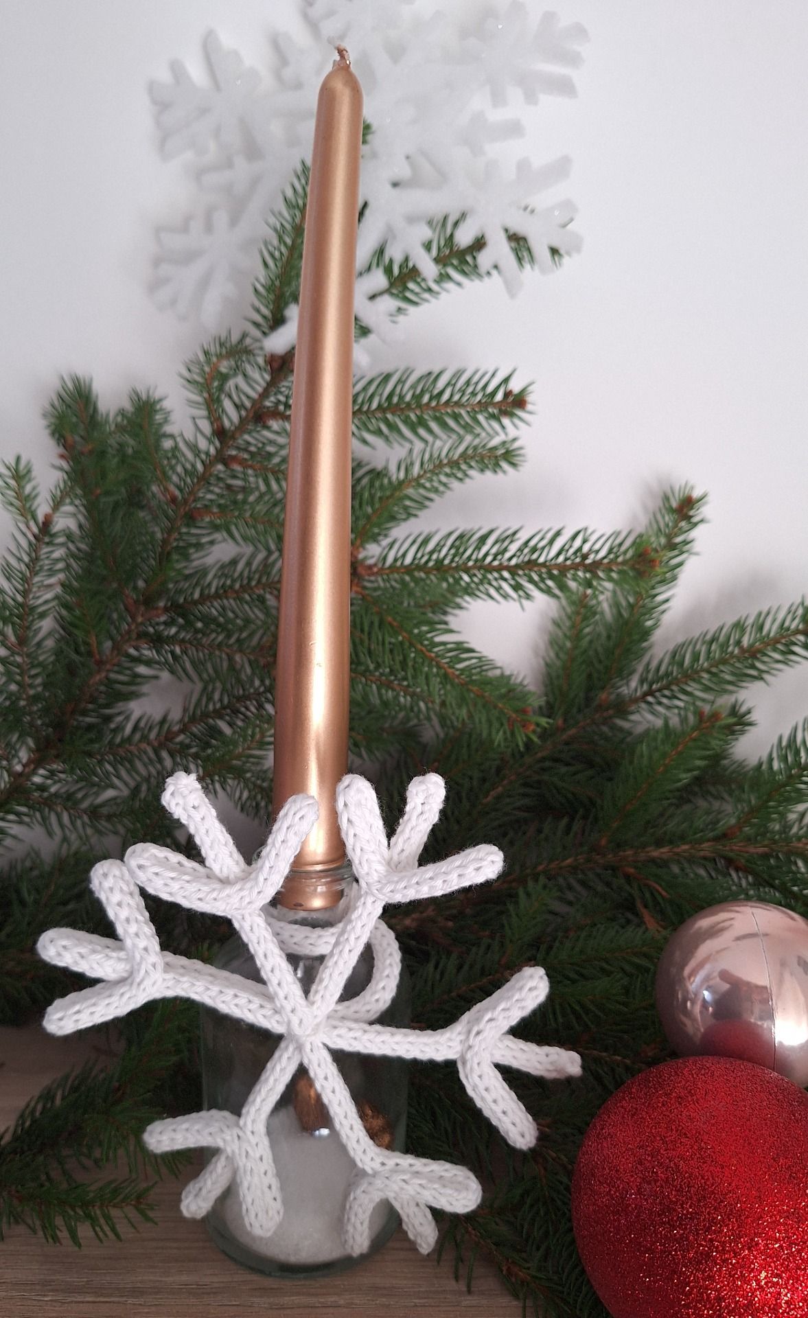 Laissez la magie opérer sur votre table ! Ce centre de table en tricotin et sa bougie illuminent vos repas de fête d’une note douce et artisanale.
