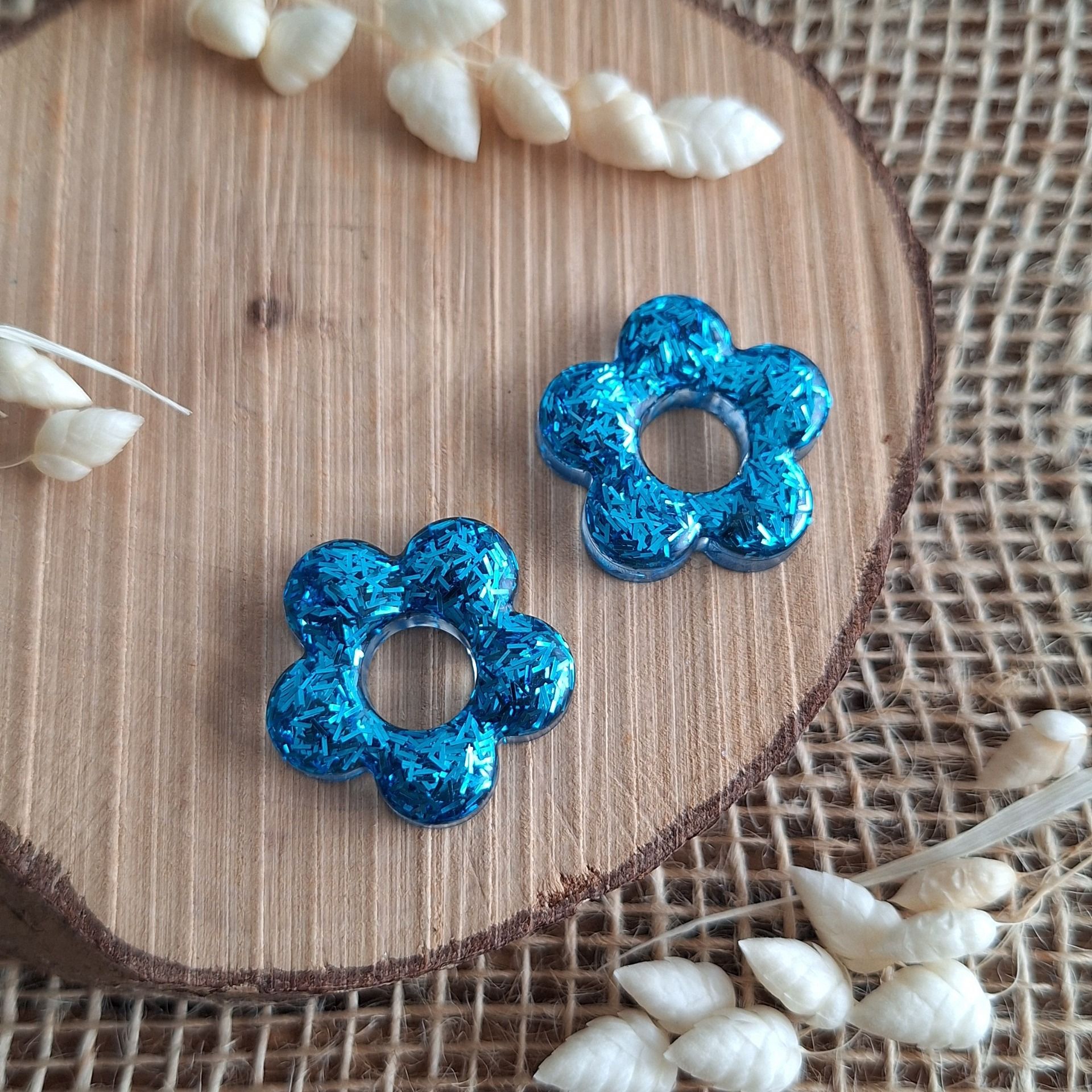 Création en résine époxy en forme de grosse fleur couleur bleue paillettes.