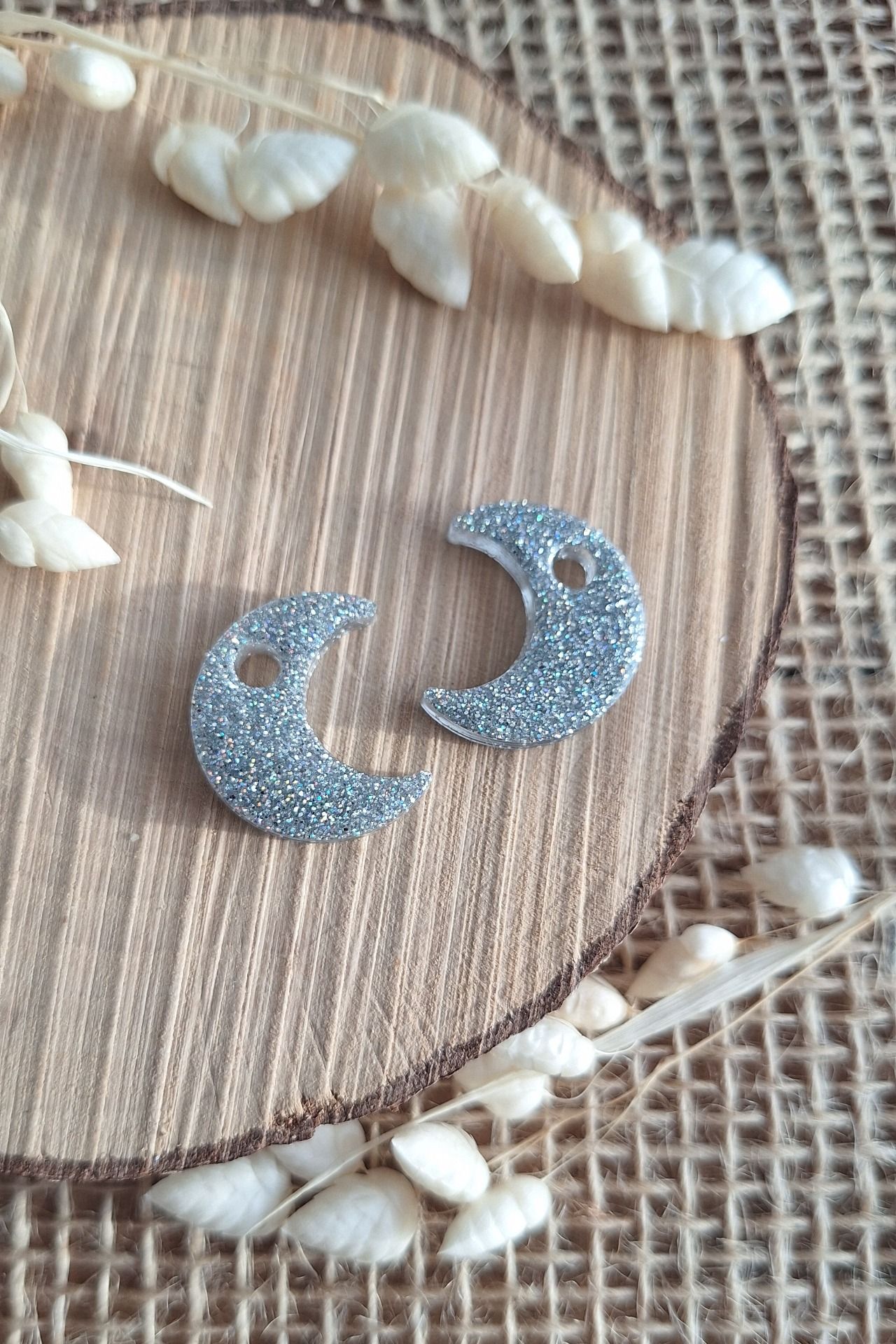 Réalisation en résine époxy en forme de Lune argent paillettes