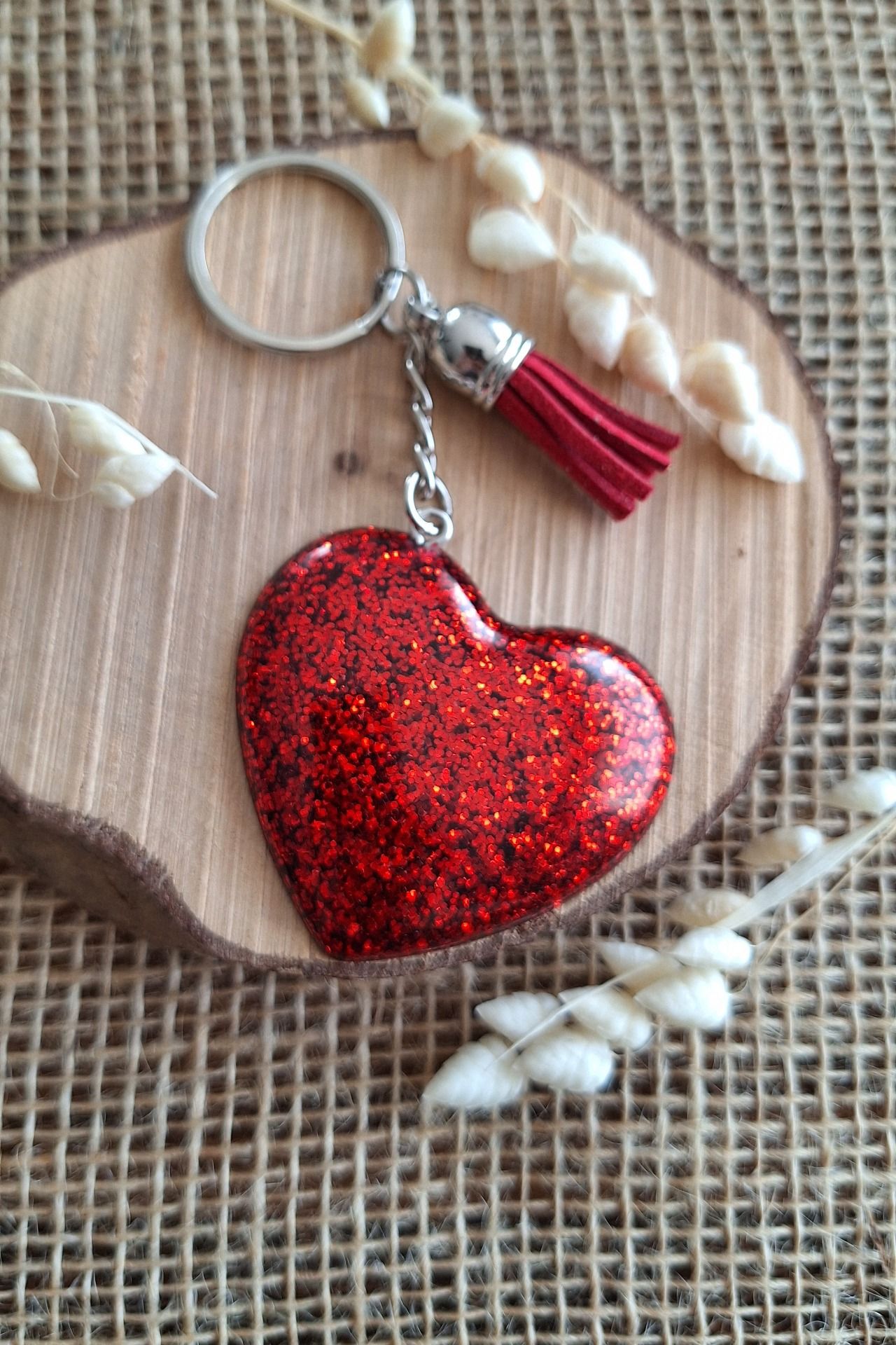 Un porte-clé cœur pailleté, délicatement réalisé à la main, parfait pour symboliser l’amour et les jolies attentions