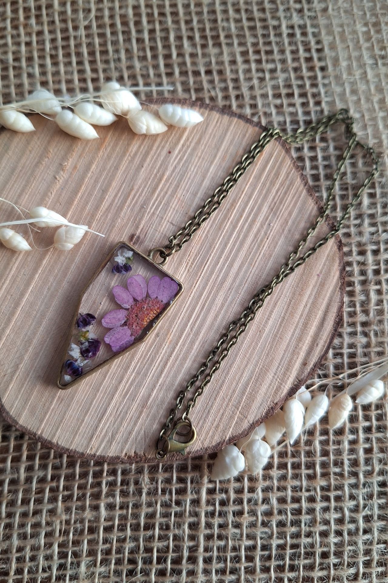 Collier réalisé à la main avec des fleurs séchées par moi même afin de créer des pièces uniques.