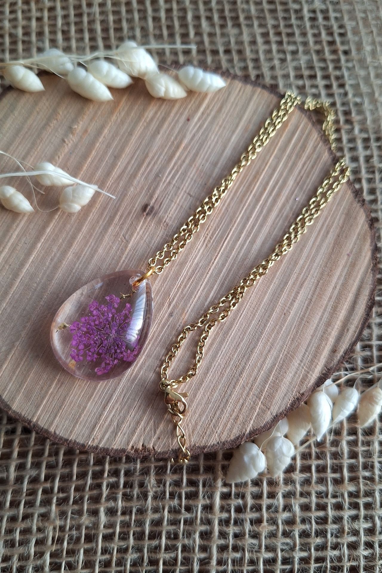 Collier réalisé à la main avec des fleurs séchées par moi même afin de créer des pièces uniques.