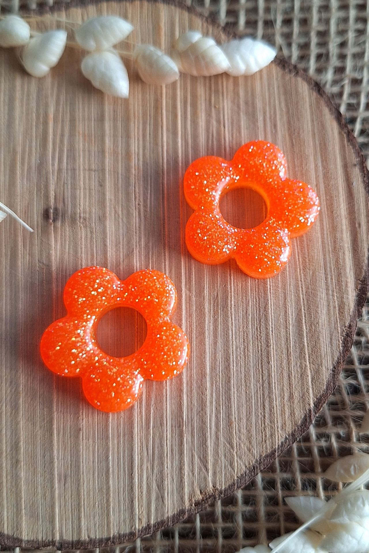 Création en résine époxy en forme de grosse fleur couleur orange fluo paillettes.