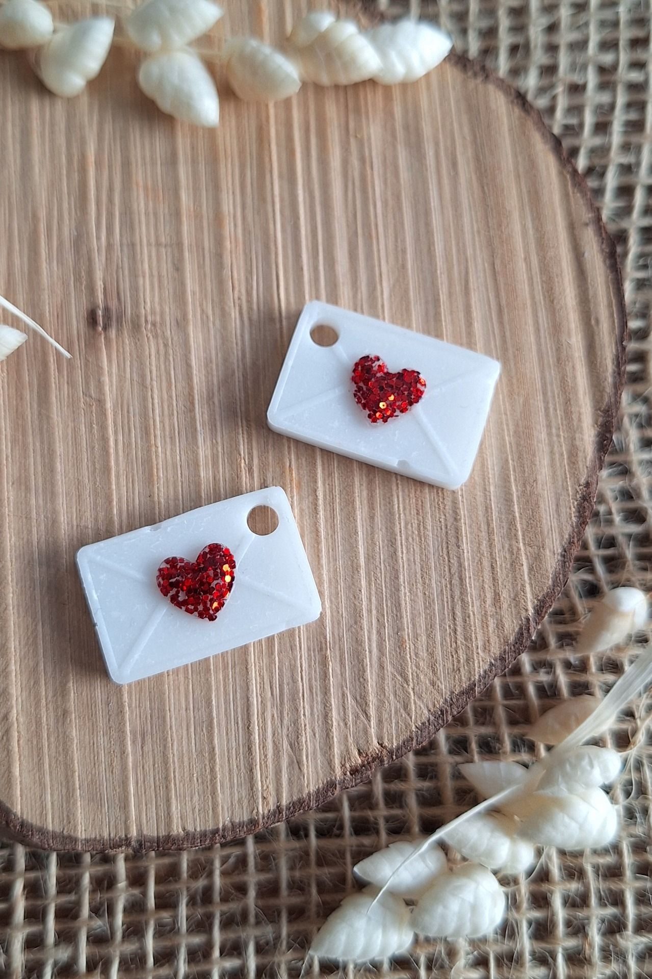 Réalisation en résine époxy en forme d enveloppe blanche avec cœur rouge paillettes