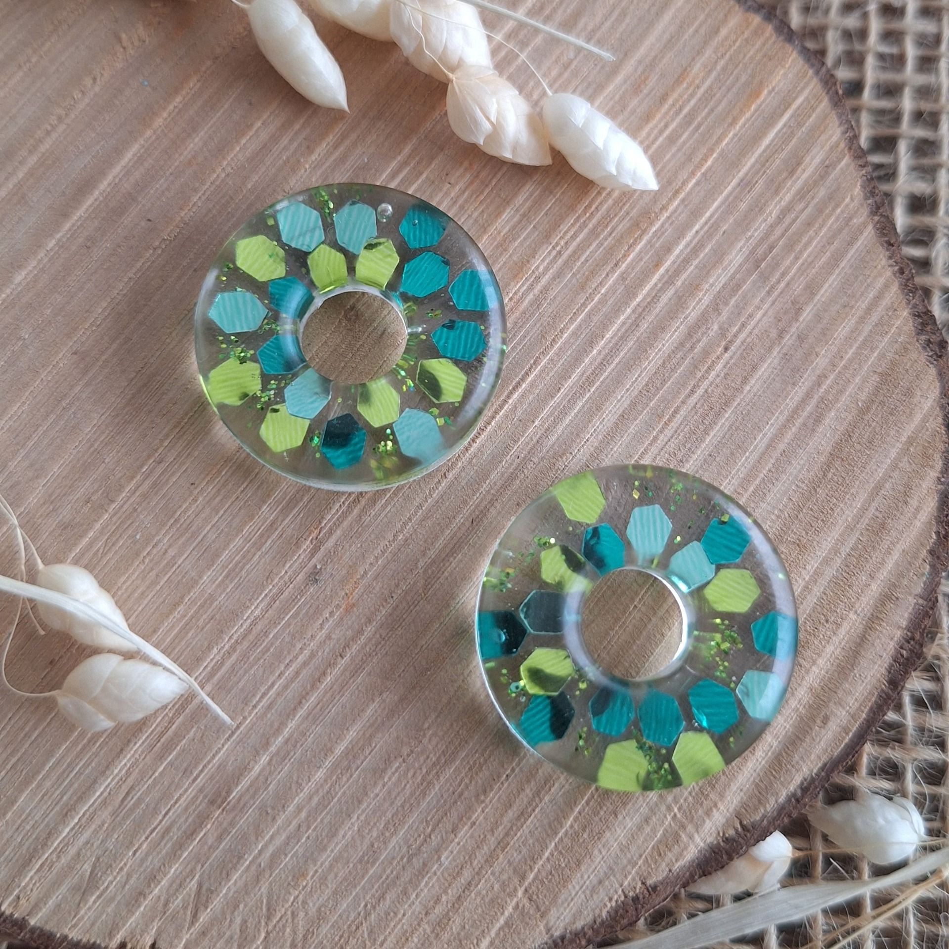 Création en résine époxy en forme de rond couleur vert paillettes.