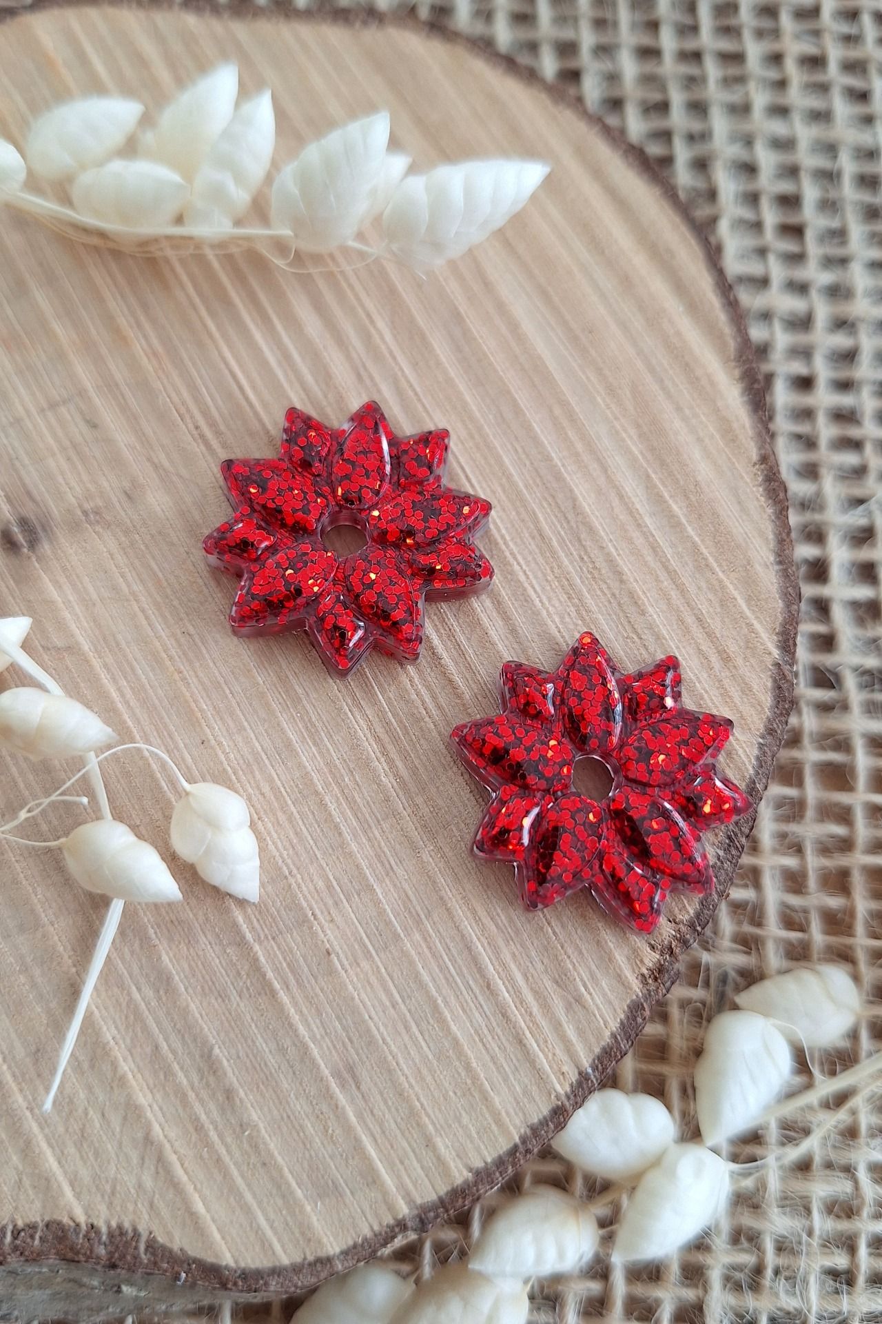 Réalisation en résine époxy en forme de poinsettia rouge paillettes