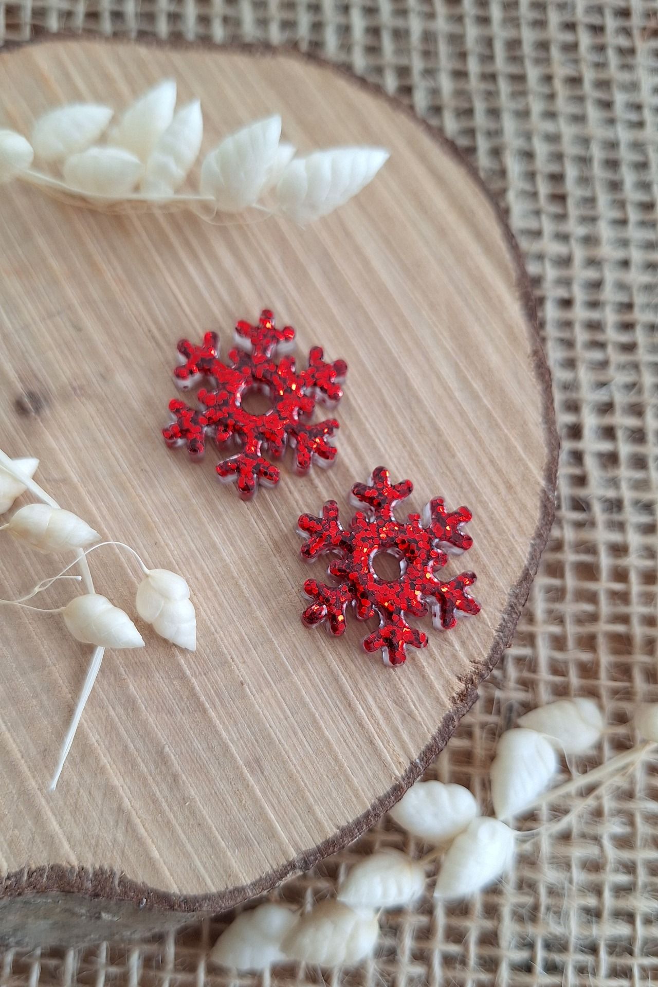 Réalisation en résine époxy en forme de flocon rouge paillettes
