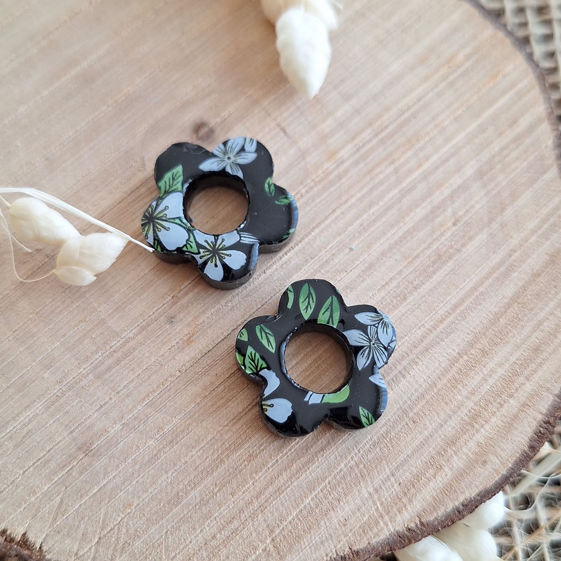 Réalisation en résine époxy en forme de fleur noire à motif fleur.