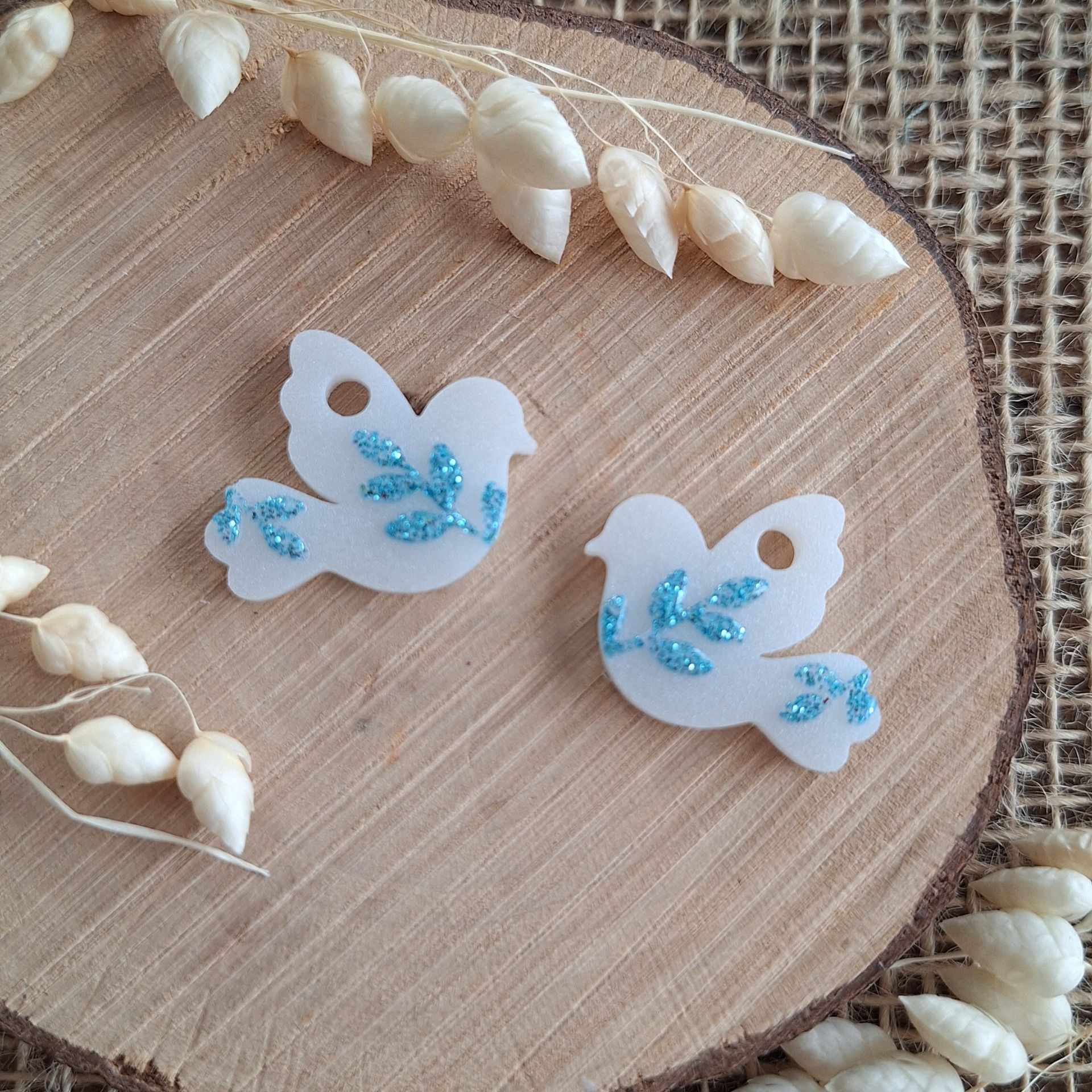 Réalisation en résine époxy en forme d'oiseau de couleur blanc et bleu paillettes