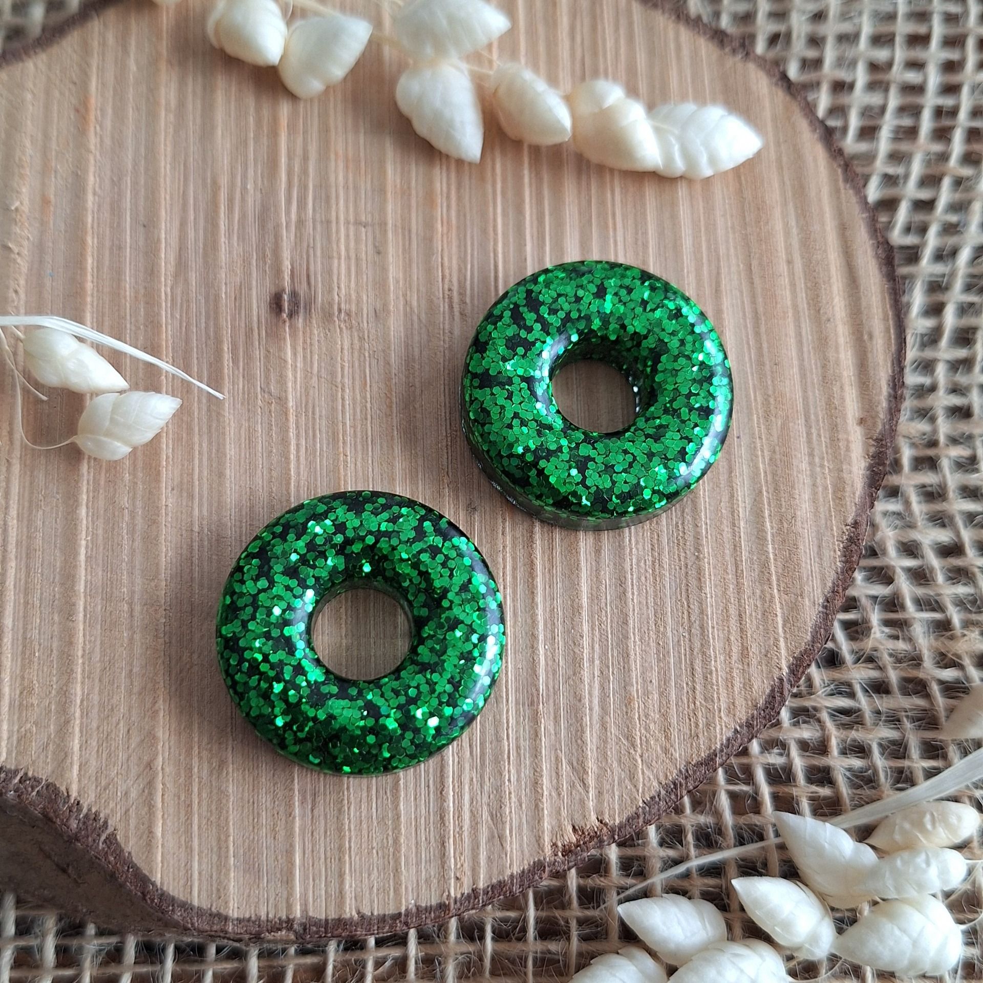Création en résine époxy en forme de rond couleur vert paillettes.