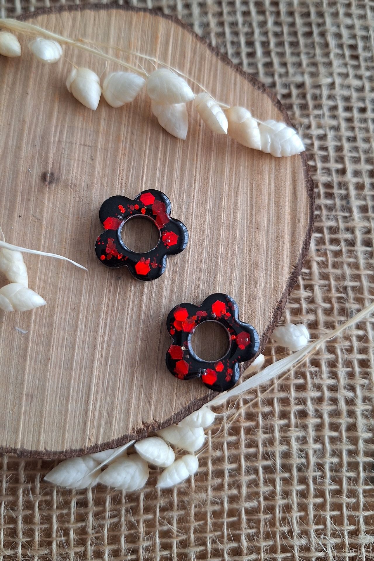 Réalisation en résine époxy en forme de fleur noires et rouge paillettes