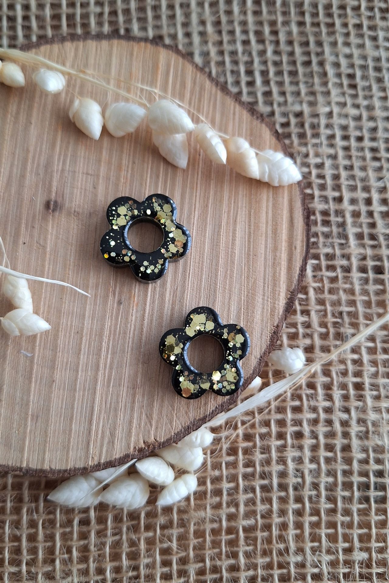 Réalisation en résine époxy en forme de fleur noires et rouge paillettes