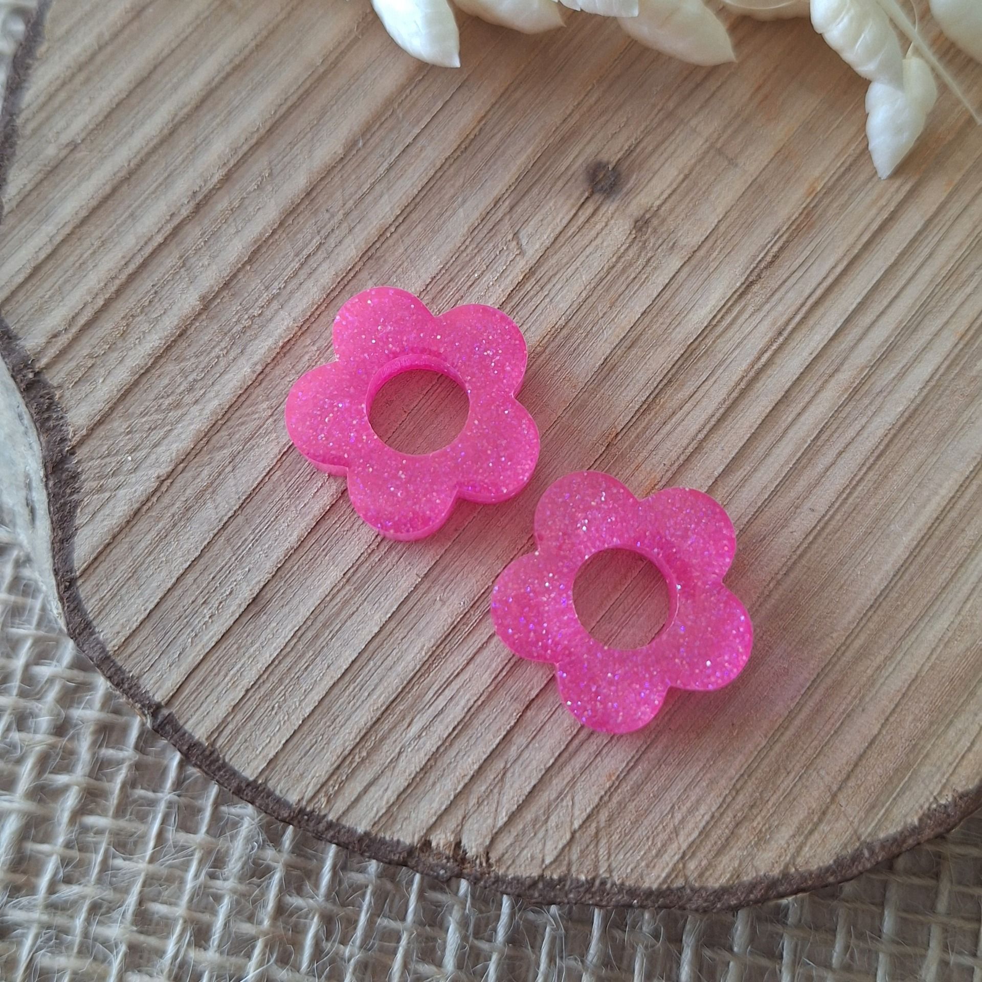 Réalisation en résine époxy en forme de fleur rose fluo paillettes.