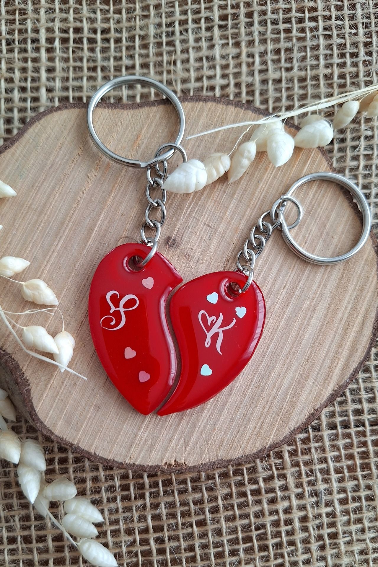 Porte-clés cœur divisé en deux, chacun sa moitié. Création en résine faite main, personnalisable avec l’initiale de votre choix, symbole d’un lien unique à emporter partout.
