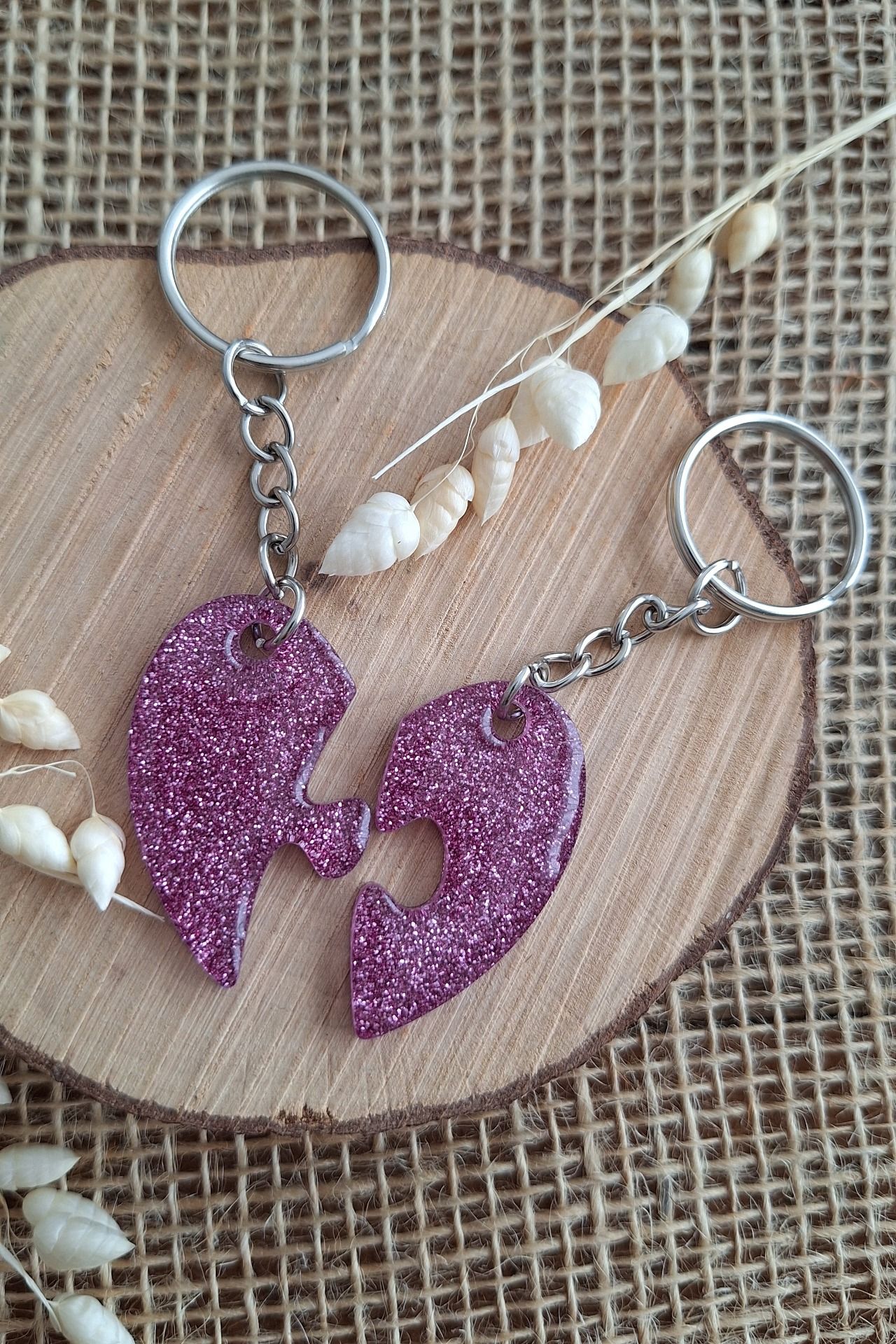 Porte-clés cœur divisé en deux, chacun sa moitié. Création en résine faite main, symbole d’amour et de lien unique à emporter partout.