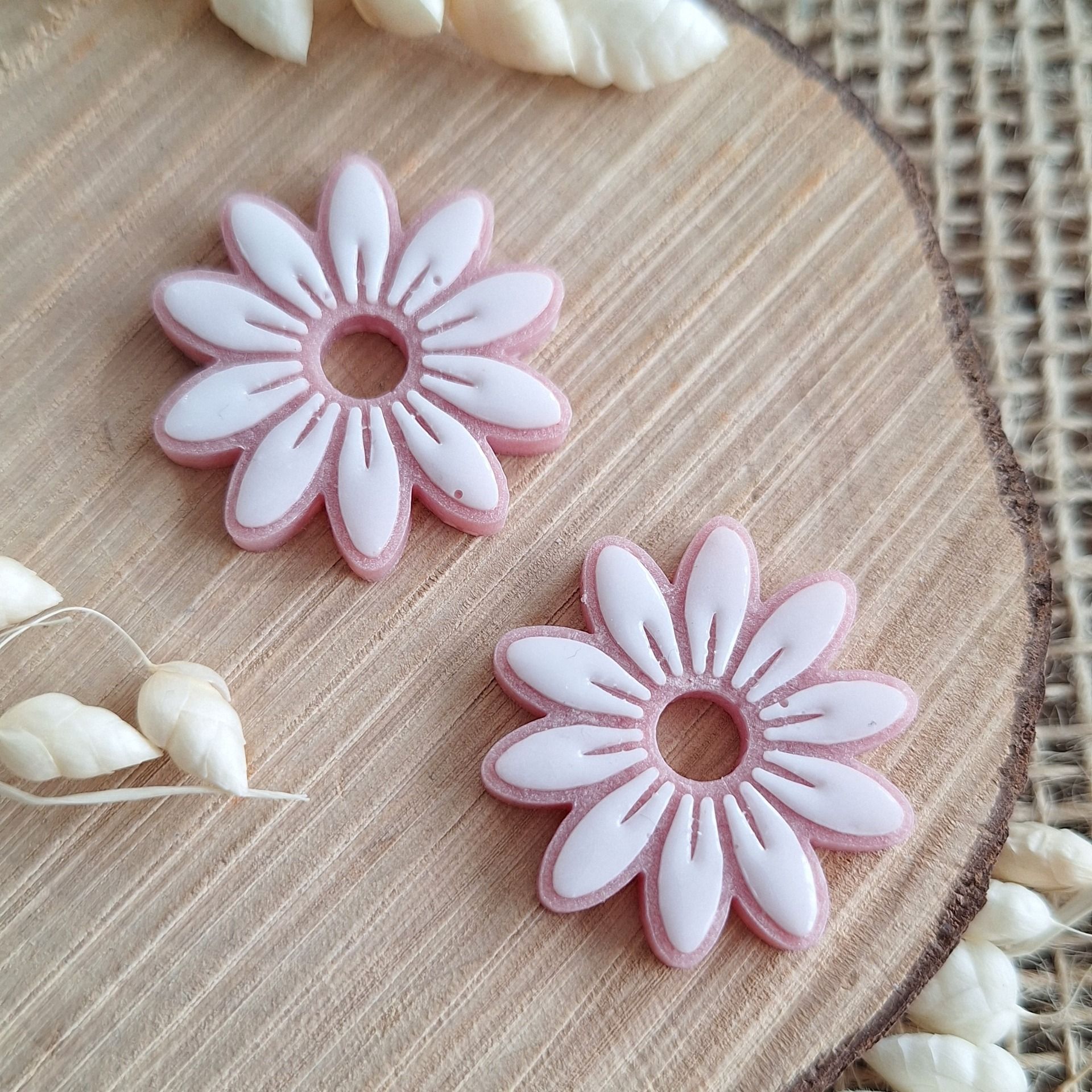 Réalisation en résine époxy en forme de marguerites rose et blanc