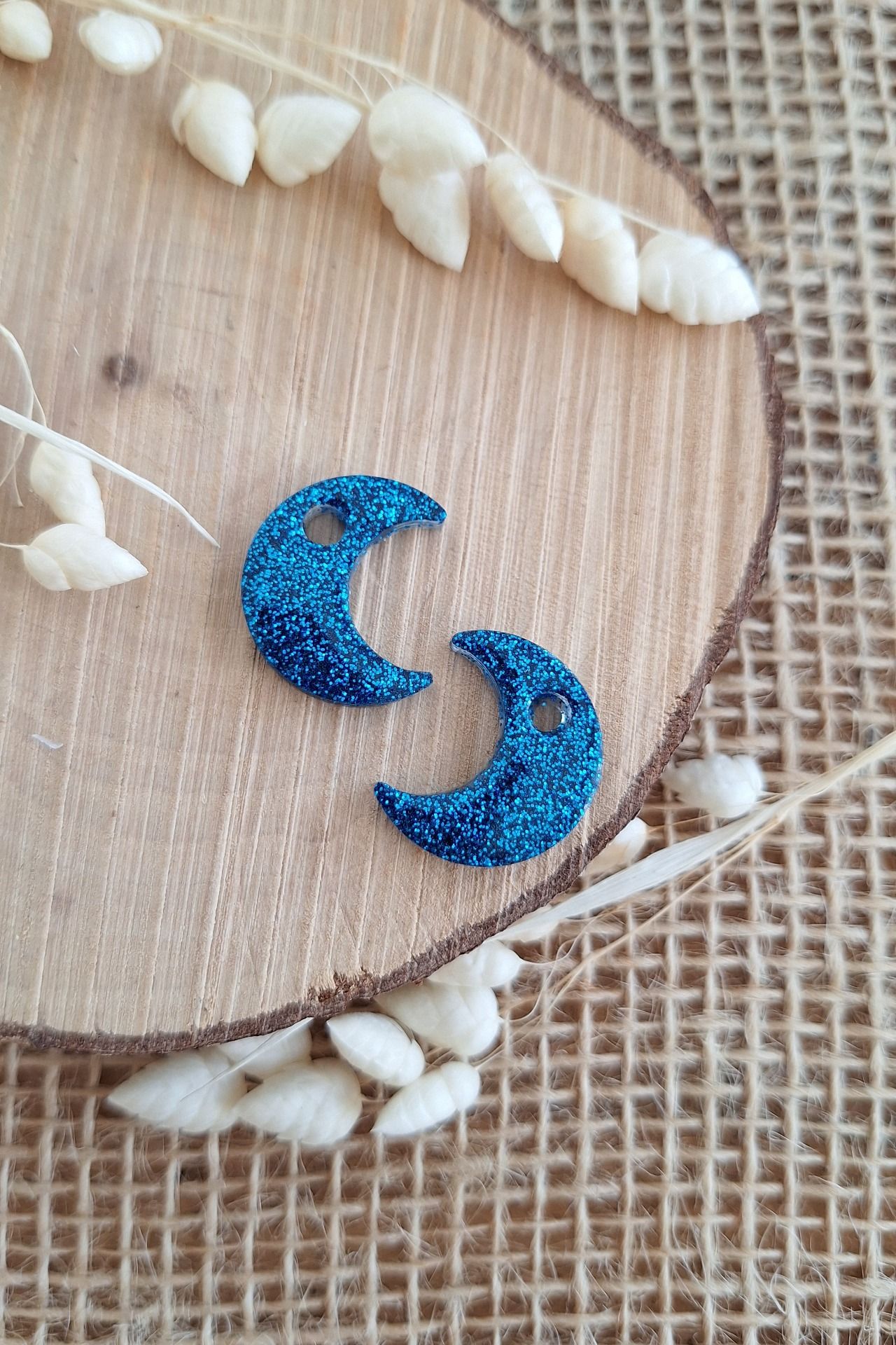 Réalisation en résine époxy en forme de Lune bleue paillettes