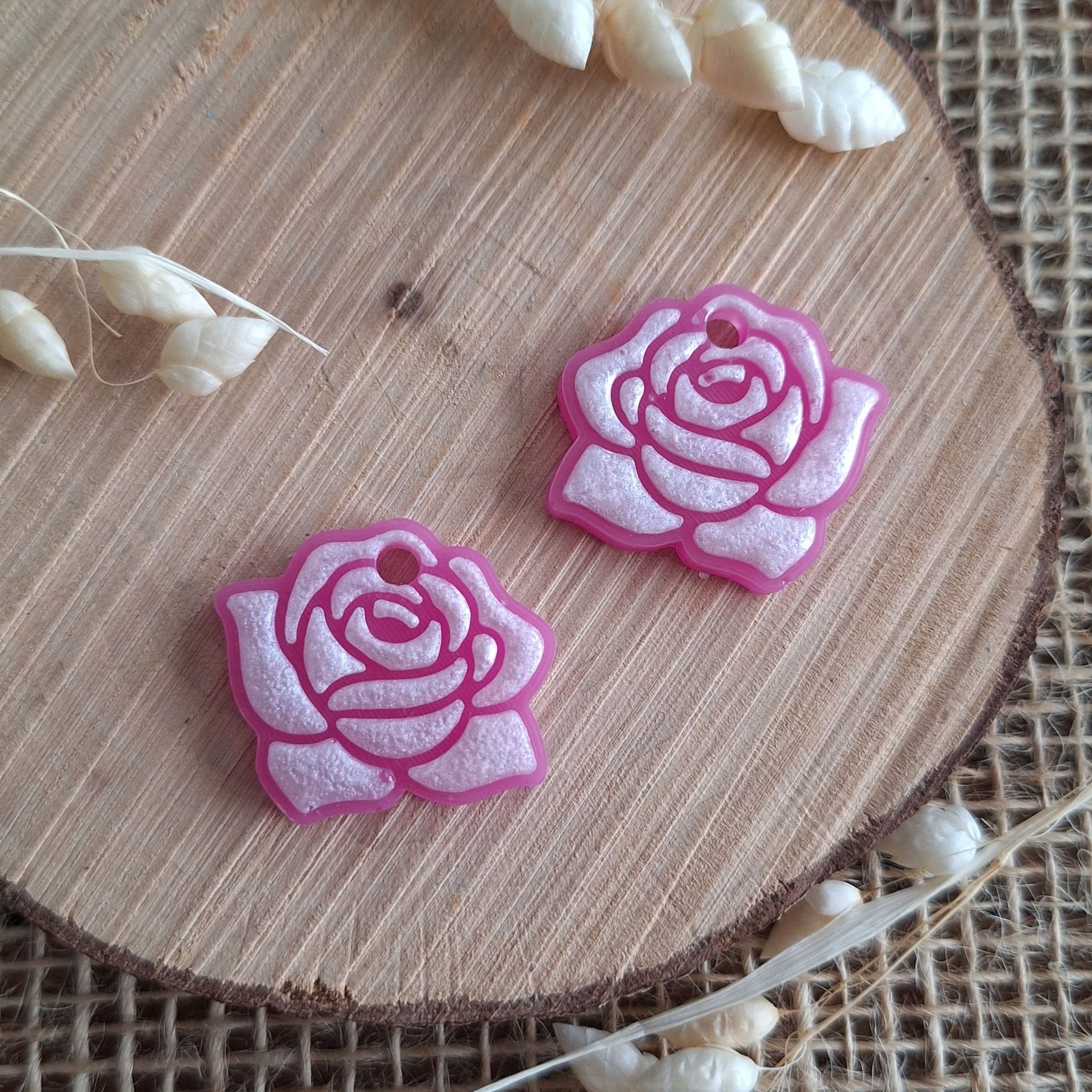 Réalisation en résine époxy en forme de rose rose fuchsia et blanche